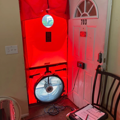 The Blower door test in an important part of our process. Usually, we run a test both before and after our job. For this test, a temporary door is fitted into your front or back door with a fan. When turned on, the air in your home is blown out, allowing us to measure how airtight your house is. This not only shows you the impact and benefit of the work we do, but also givies us an opportunity to identify any potential duct disconnections or ventilation problems in your home.